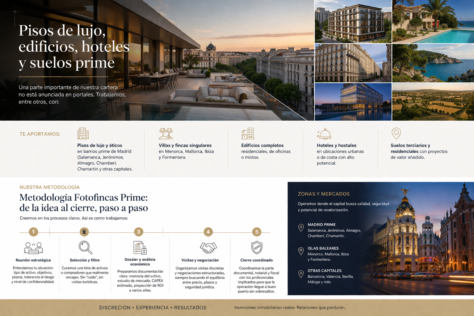 No somos una agencia masiva. Trabajamos con un numero limitado de operaciones al ano para poder dedicar tiempo, analisis y atencién al detalle en cada activo: desde el piso de lujo en Madrid, hasta el edificio completo, el hotel urbano o la villa singular en Baleares.